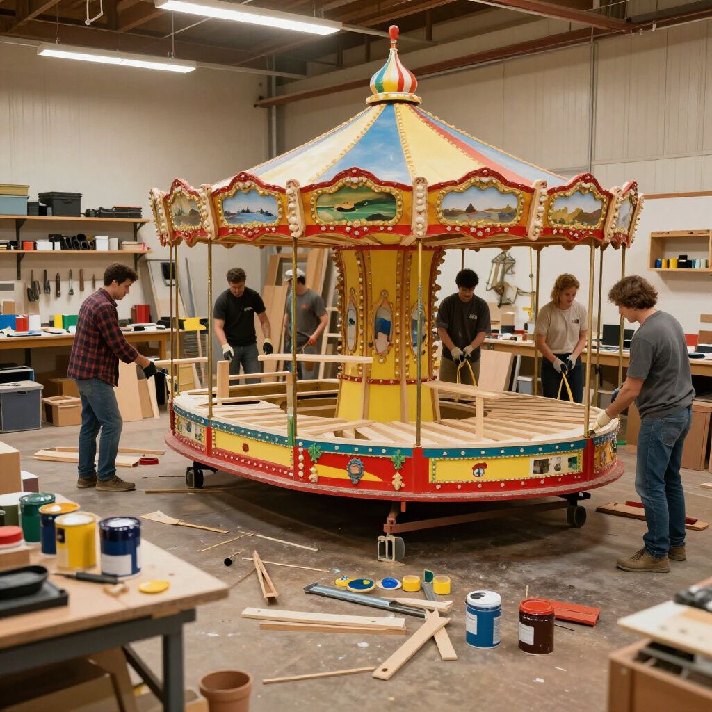 Vervolgens bouwen we het frame en verwerken we materialen zoals hout, papier-maché en verf. Dit is het moment waarop het ontwerp tot leven komt in onze werkplaats.