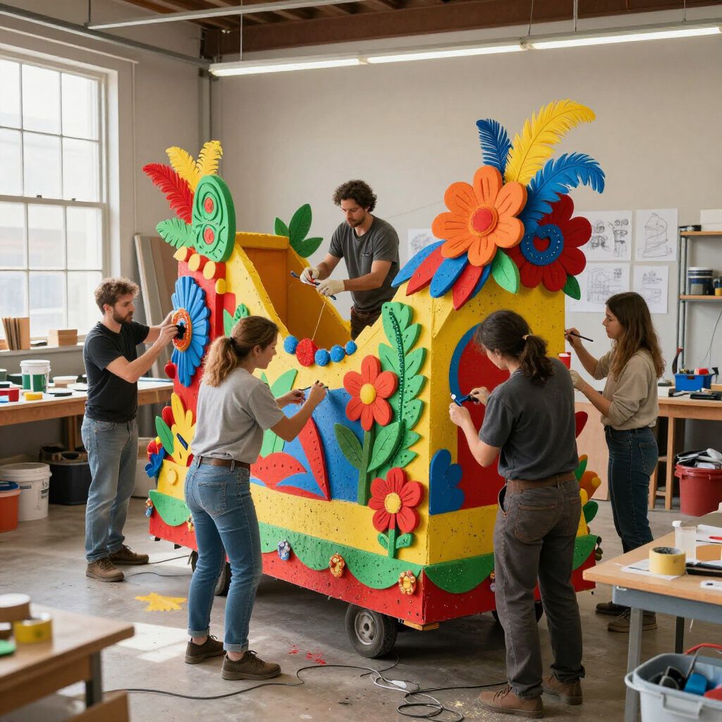 Tot slot brengen we de details aan: van schilderwerk tot het bevestigen van accessoires. Zo zorgen we dat elke wagen uniek en kleurrijk wordt voor het carnavalsfeest.
